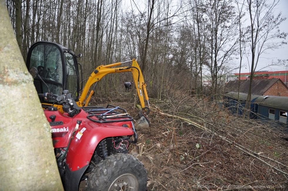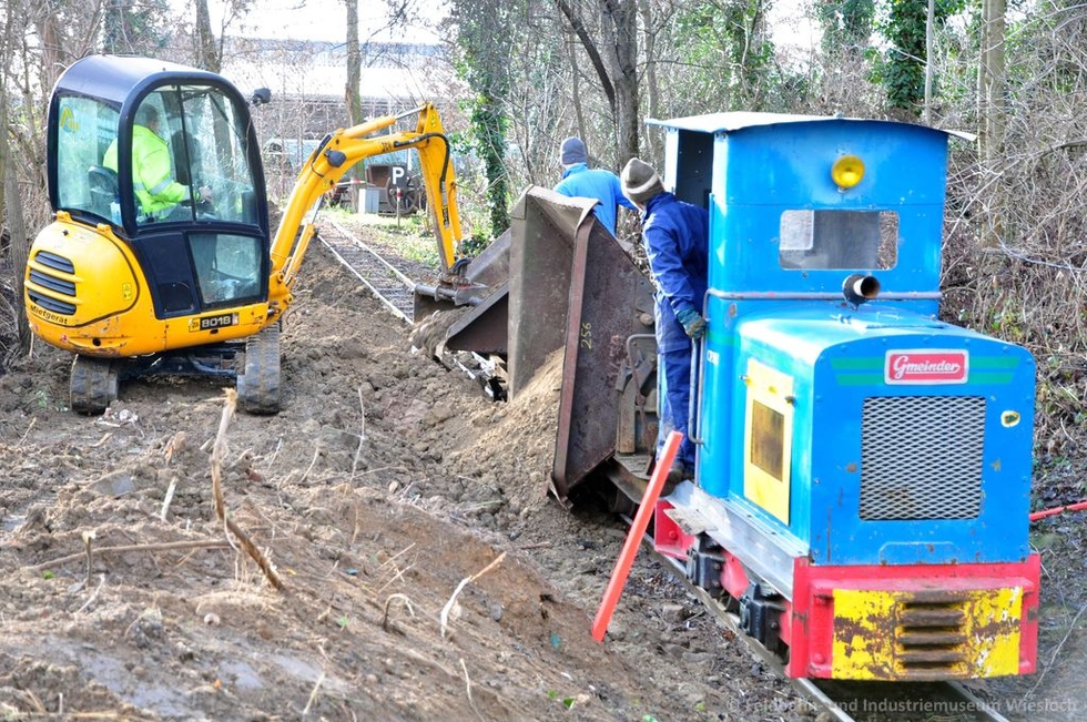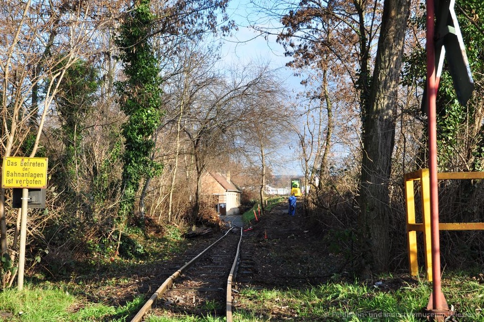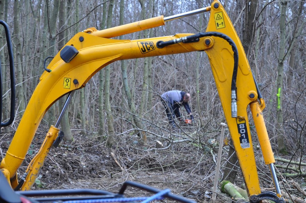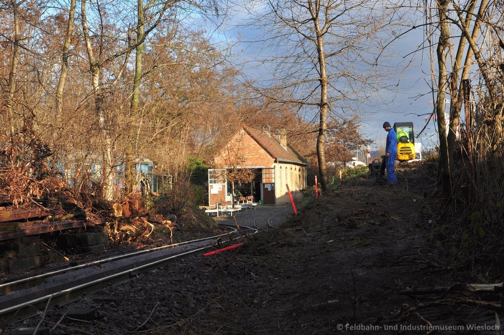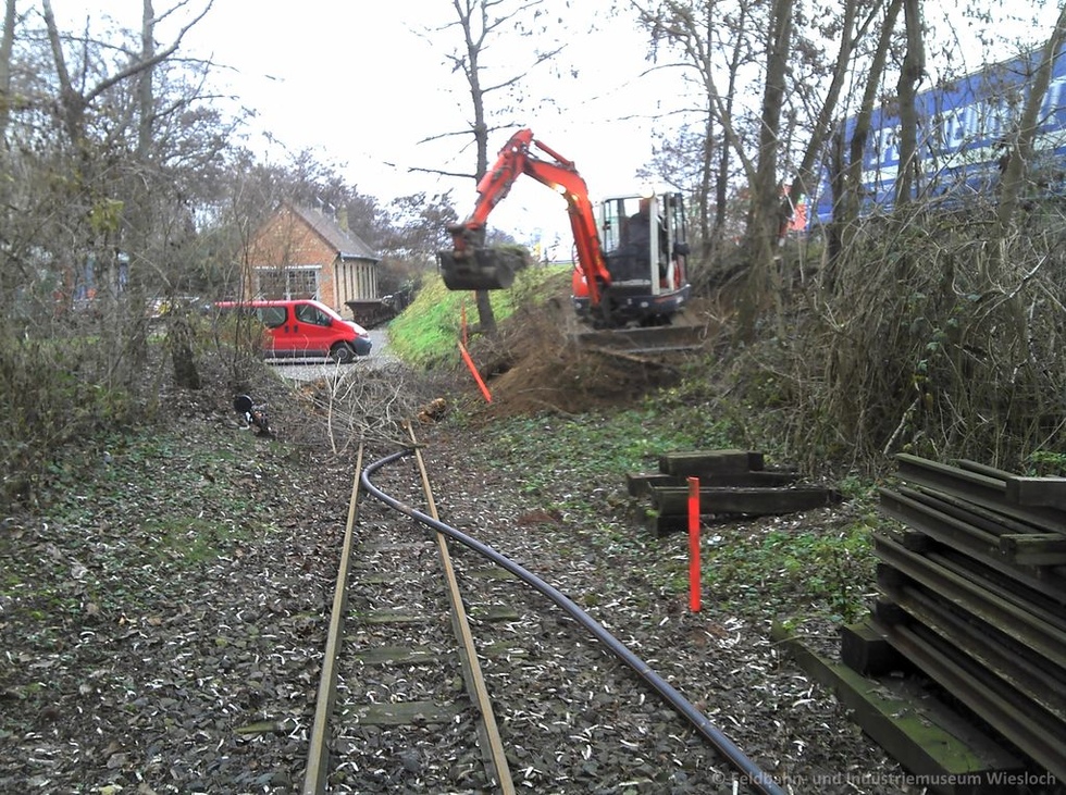 Es geht los: wir erweitern unser Streckennetz. Mit freundlicher Genehmigung der Stadt Wiesloch dürfen wir nun auch den hinteren Teil des Grundstücks für die Feldbahn nutzen. An unserer bisherigen Hauptstrecke bauen wir im Laufe des Jahres 2012 eine Weiche ein, verlegen Gleise entlang der Straße, um dann im großen Bogen in den Wald abzubiegen. Dort geht es dann mitten durch's Gehölz zum Eimerkettenbagger.