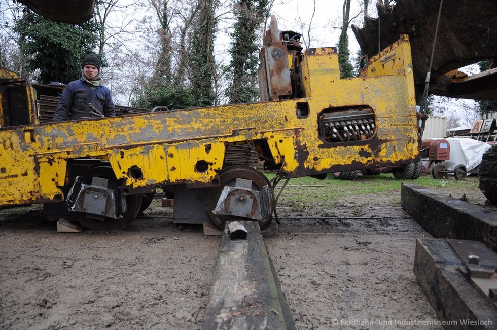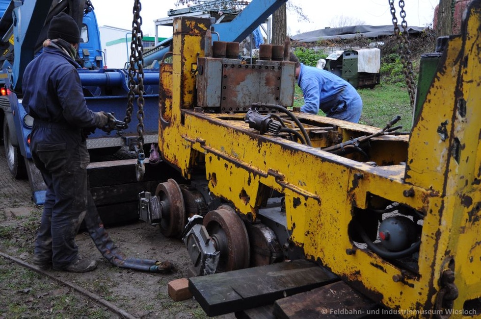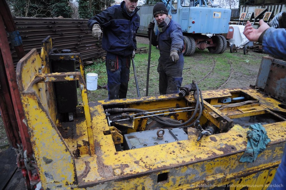 Kurz nach Neujahr transportierte ein Absetzkipper den Lokrahmen auf unser Vereinsgelände. Dort warteten bereits die auf 600mm umgespurten Radsätze inkl. der angeflanschten Elektromotoren auf den Einbau. Dies erwies sich jedoch als äußerst kniffelige Angelegenheit. Wir benötigten mehrere Stunden und schweres Gerät, um die Teile millimetergenau einzupassen.