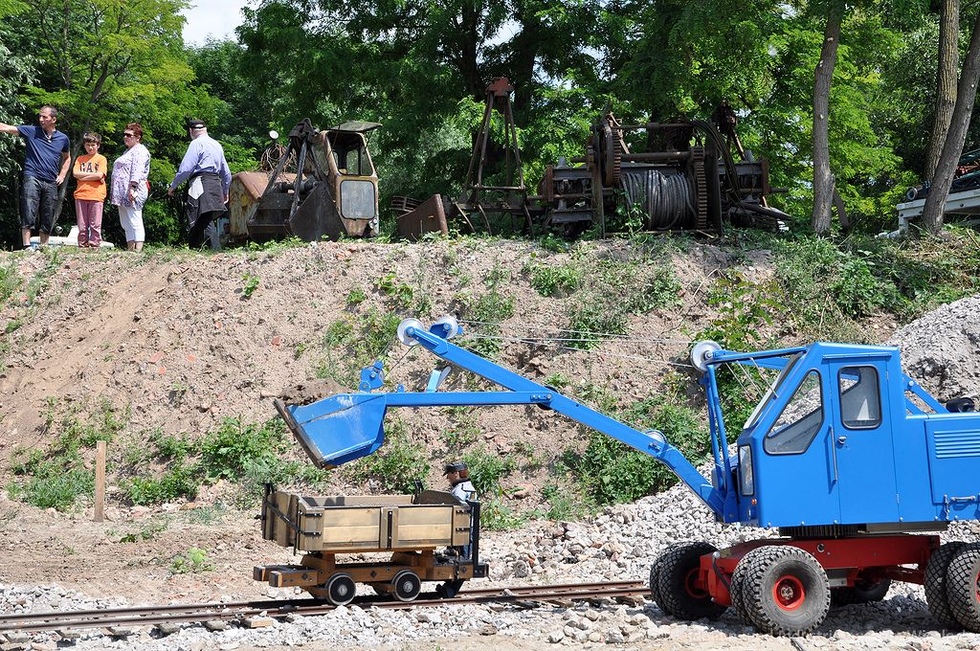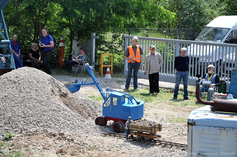 - Fuchs F301 mit Hochlöffel als maßstabsgetreues, ferngesteuertes Modell beim Beladen einer Modell-Feldbahnlore mit Schotter (Maßstab 1:3, Elektroantrieb)