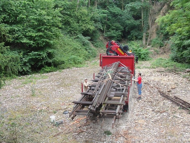 Die letzten fünf Bilder zeigen außerdem eine Schienenbergung im Juni 2014 in Dossenheim. Auch diese Schienen waren hart verdient. Sie mußten völlig zugewachsen aus einem Wald per Seilwinde gezogen werden.