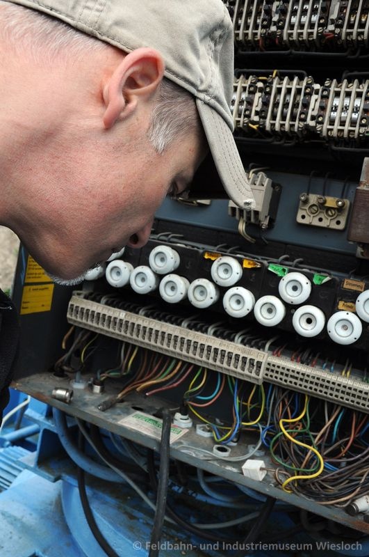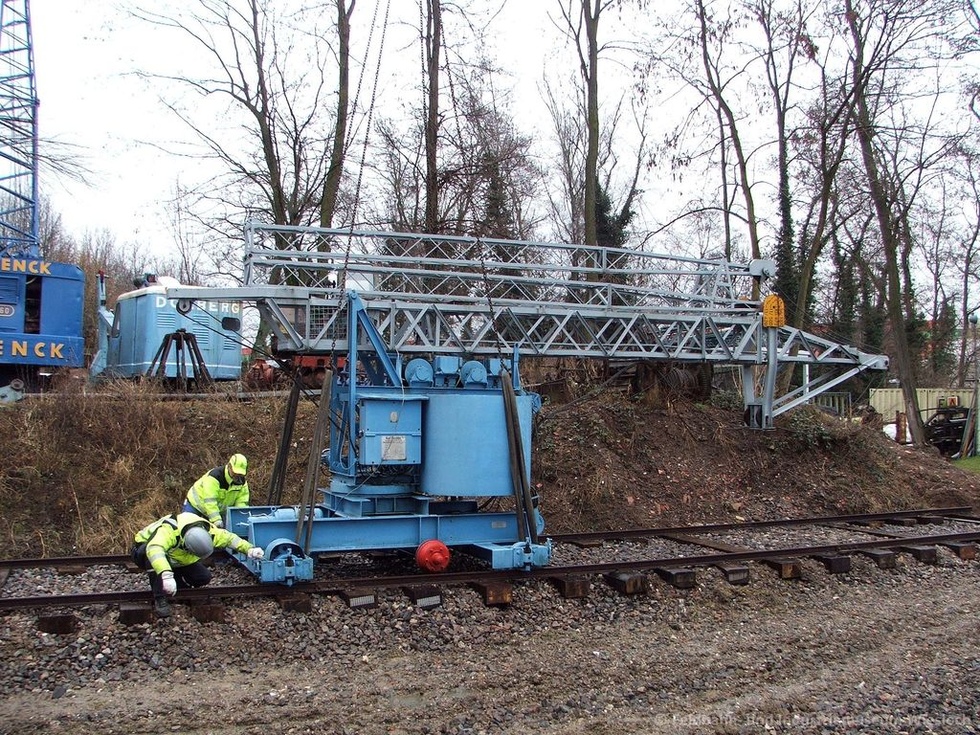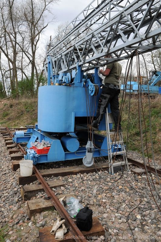 Nachdem wir im Januar und Februar eine entsprechende Schienenbahn konstruiert hatten und der Kran Ende Februar per Tieflader angeliefert wurde, begannen für uns die Instandsetzungsarbeiten. Obwohl der Kran prinzipiell in einem sehr guten Zustand ist, ist die Elektrik reparaturbedürftig. Einige Originalersatzteile sind zu besorgen, viele Kabel sind zu ersetzen und auch eine "neue" (kabelgebundene) Fernbedienung muss beschafft werden.