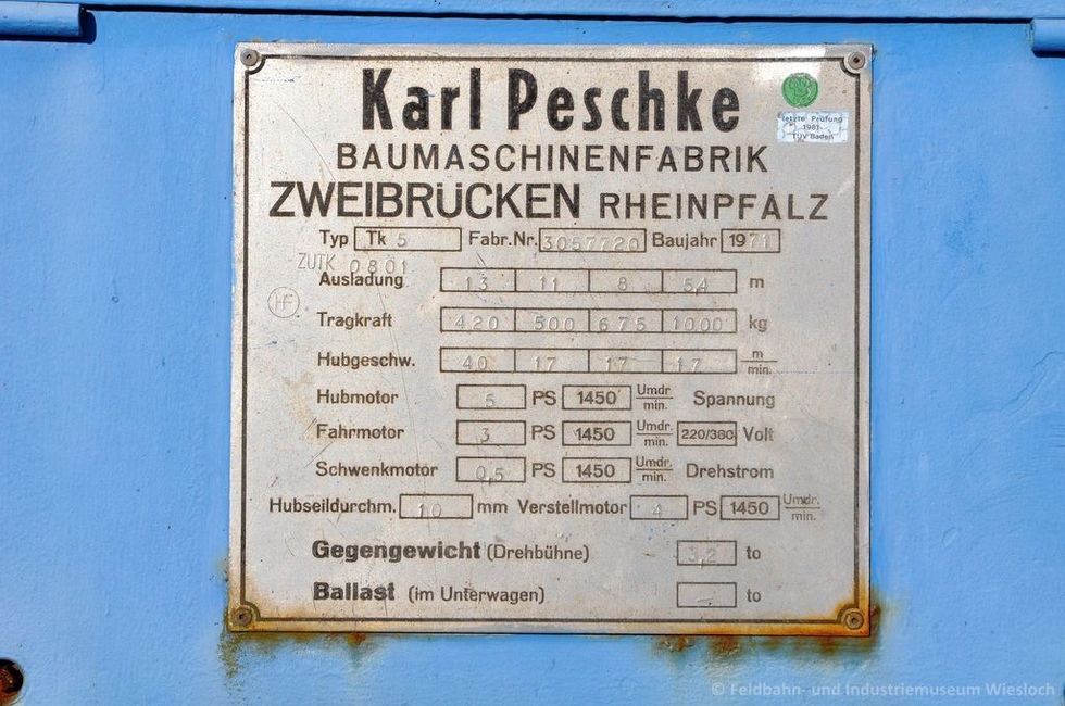 Unser Museum ist um ein historisches Gerät reicher: ein Drehkran mit Nadelausleger der Firma Karl Peschke aus Zweibrücken. Der Kran hat die Bezeichnung Pekazett TK5F und ist Baujahr 1971.