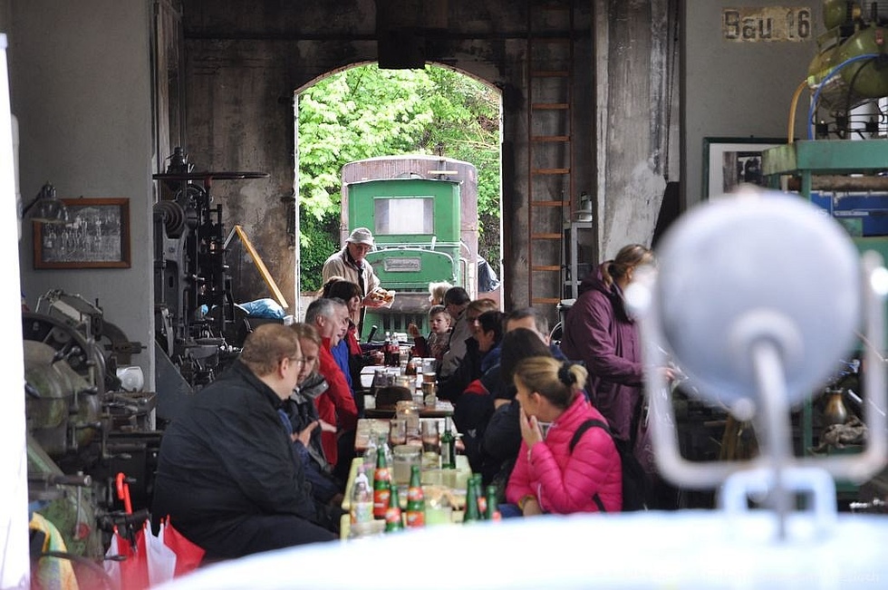 Dieses Jahr war der 1. Mai leider ein kühler und verregneter Tag. Wie wohl bei allen anderen Veranstaltungen in Wiesloch war an diesem Tag der Besucheransturm sehr verhalten. Um unseren Gästen dennoch einen trockenen und gemütlichen Platz zur Verfügung zu stellen, räumten wir kurzerhand unseren Lokschuppen leer und stellten dort die Bierbänke auf. Wie auf dem Bild zu sehen ist, wurde das Angebot dankbar angenommen.