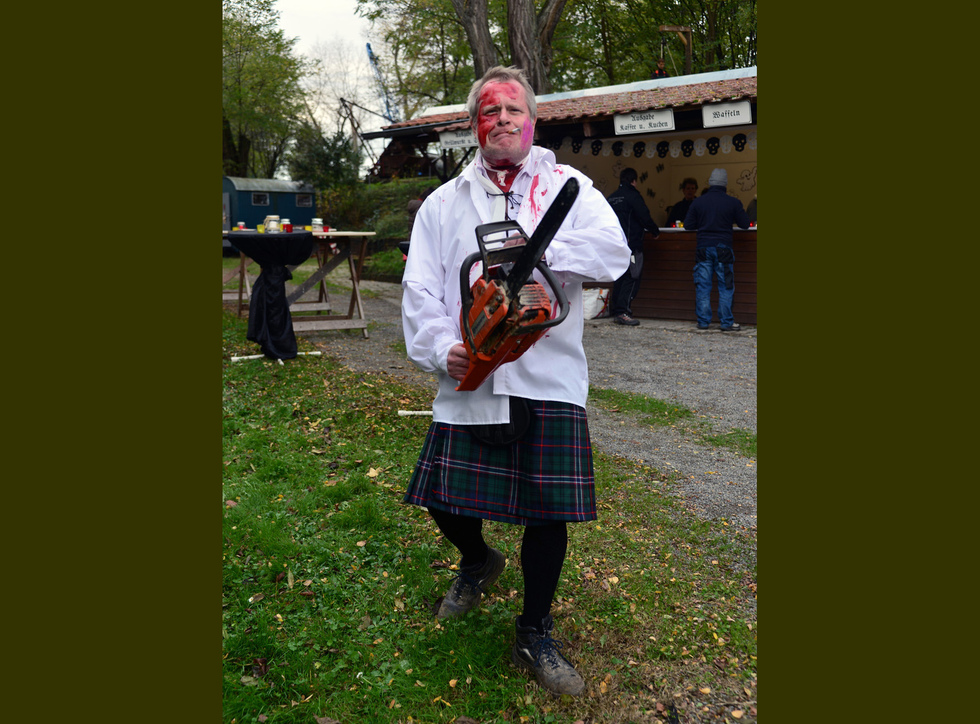 Dazu kam ein unheimlicher Kettensägenschotte, der mit plötzlicher laut aufröhrender Säge hinter einem stehen konnte und die Knie weich werden ließ. Einige Kinder ließen sich durch "Das war doch nur der Walter, das ist ein guter Freund von uns. Das ist ein ganz Lieber" wieder besänftigen.