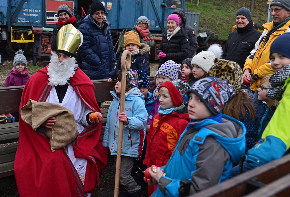 Auf den offenen Wagen fuhren wir durch den jetzt kahlen Wald und auf einigen der Fahrten wartete tatsächlich der Nikolaus auf dem Bahnübergang, um sich zu den Kinder in den Zug zu setzen und die letzen Meter mitzufahren. Zurück im Bahnhof verteilte der Nikoaus, der extra vom Nordpol kam (und sogar den Stau auf der A6 überstand) an die Kinder kleine Geschenke - Obst und Süßes.