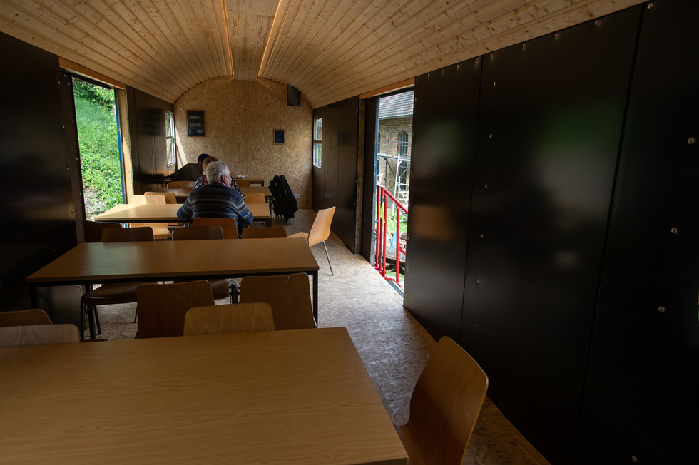 Unser ehemaliger Bauwagen präsentierte sich erstmals an einem Fahrtag, mit Tischen und Stühlen ausgestattet und mit einem Durchgang zum dreiachsigen Vereinswagen. Die Besucher konnten den Veranstaltungs-, Aufenthalts- und Regenzufluchtsort schon nutzen.