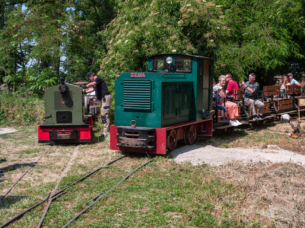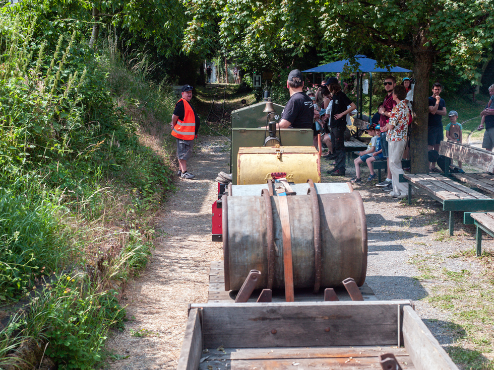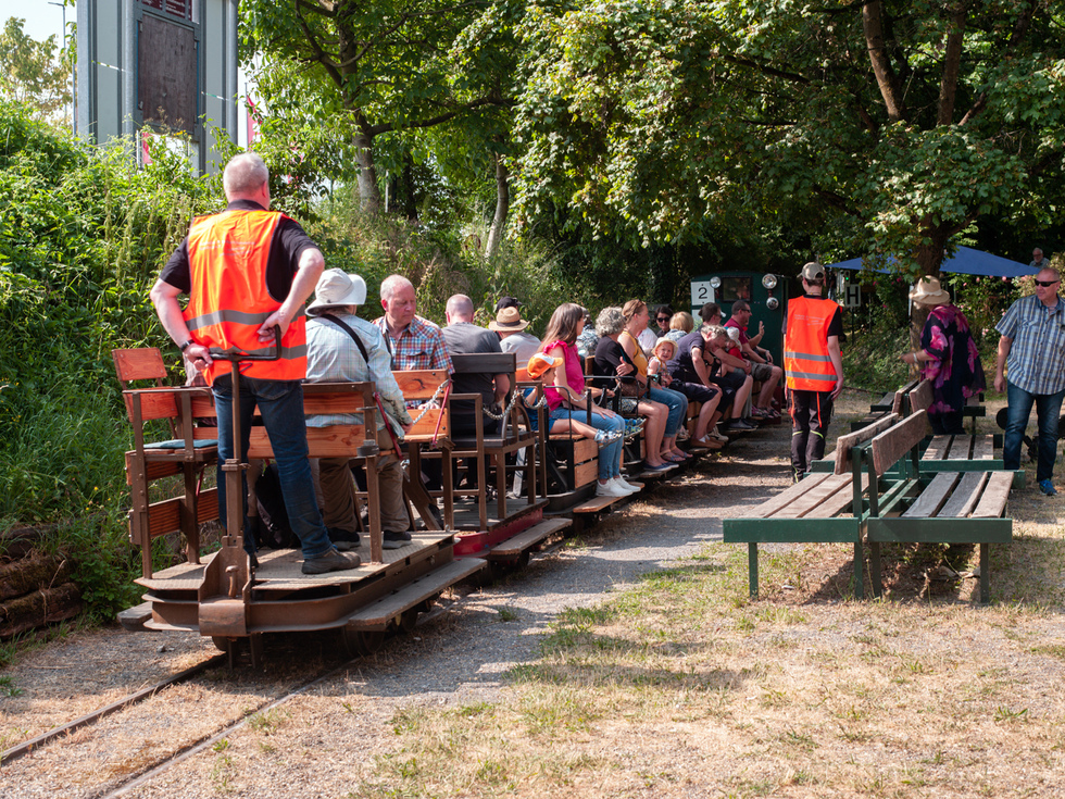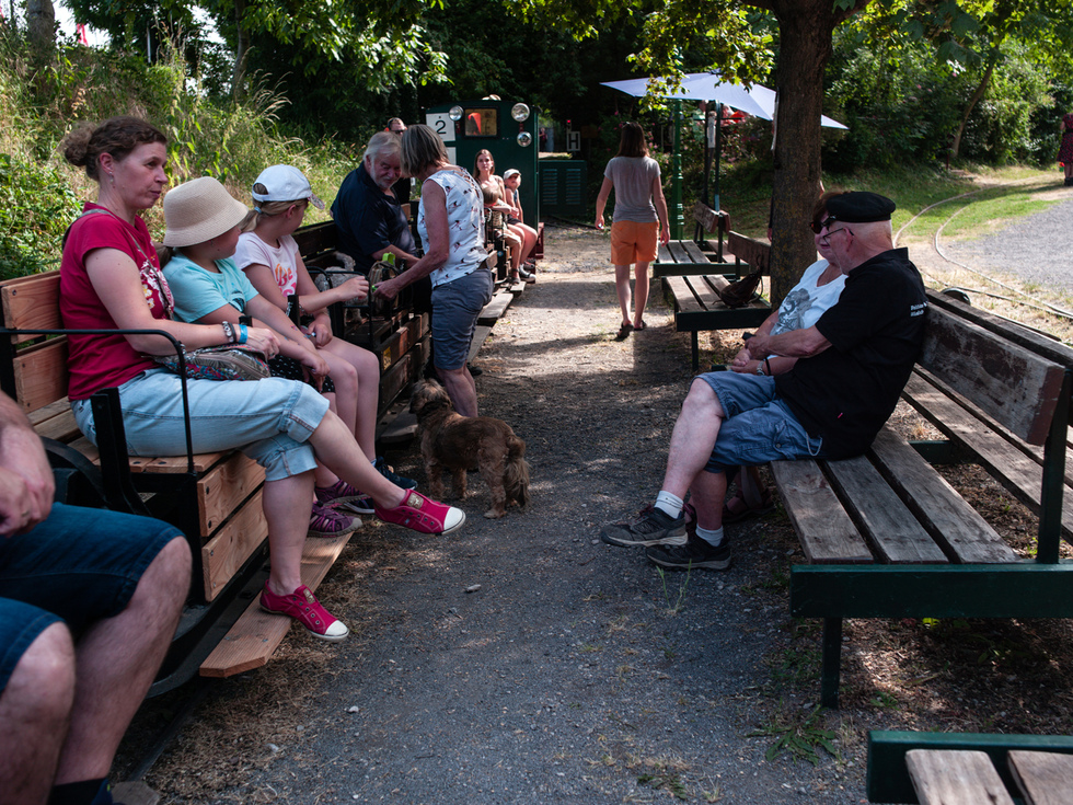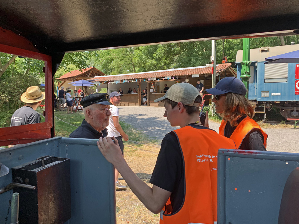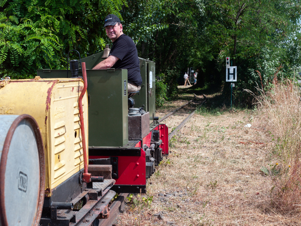 Auf den offenen Personenwagen in den offenen Lokomotiven und im Schatten konnte dieser Tag genossen werden. Auf der Diema-Lokomotive jedoch wurden 50 Grad gemessen und auch die Staßenposten hatten es trotz der Sonnenschirme nicht leicht.