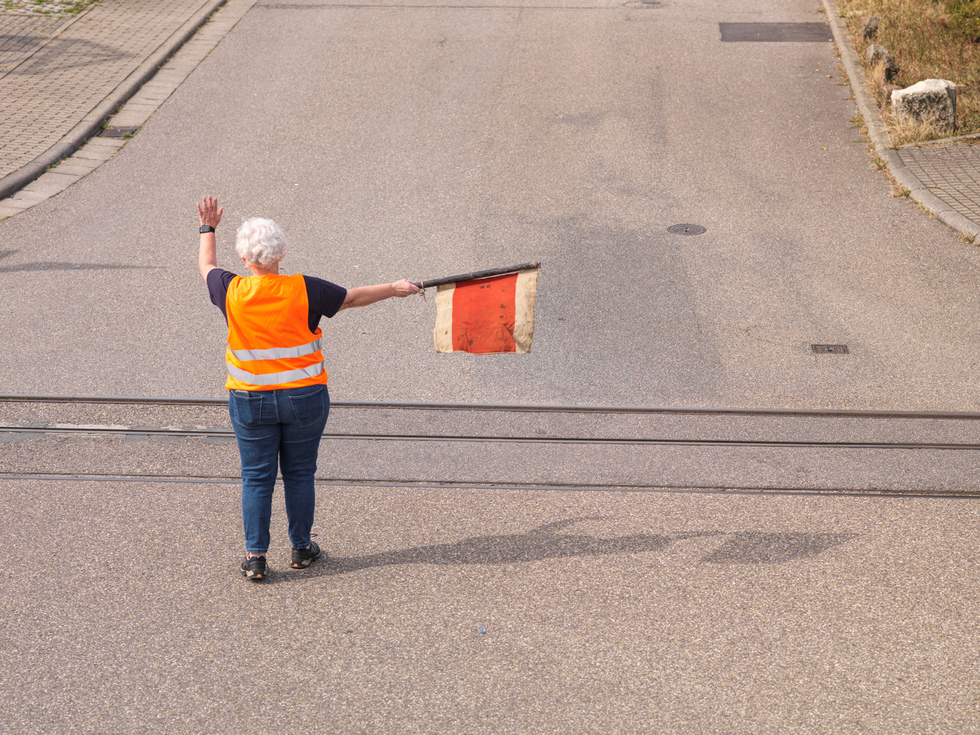 Auf diesen Bildern sind beide Straßenquerungen mit den Sicherungsposten zu sehen. Auch die Bremser tragen Westen ... man weiß ja nie was kommt.