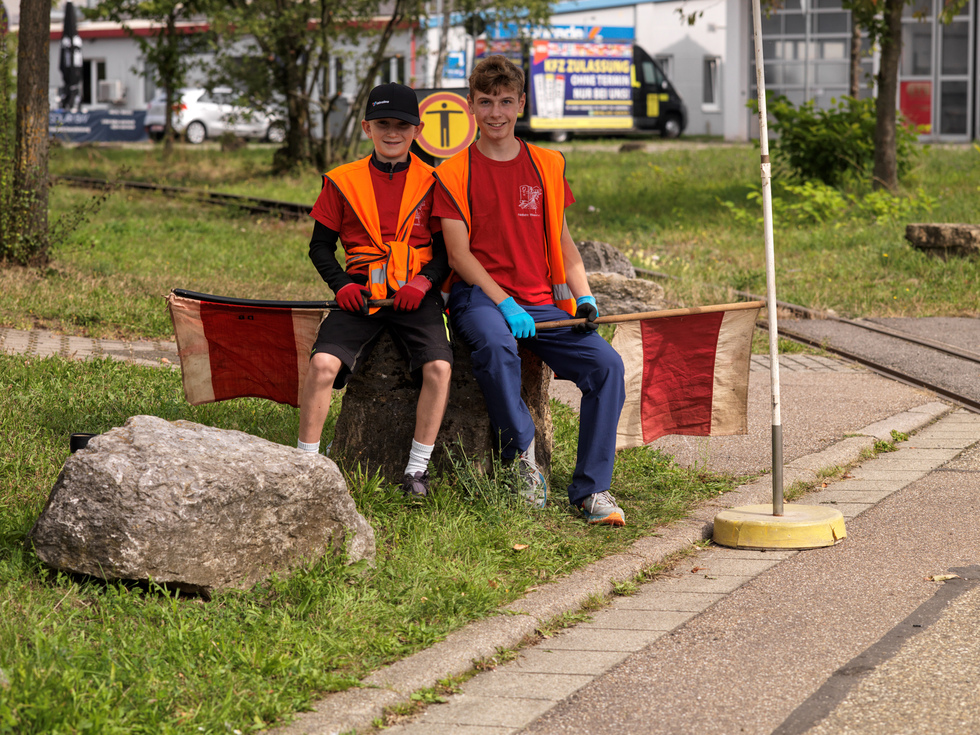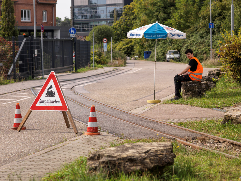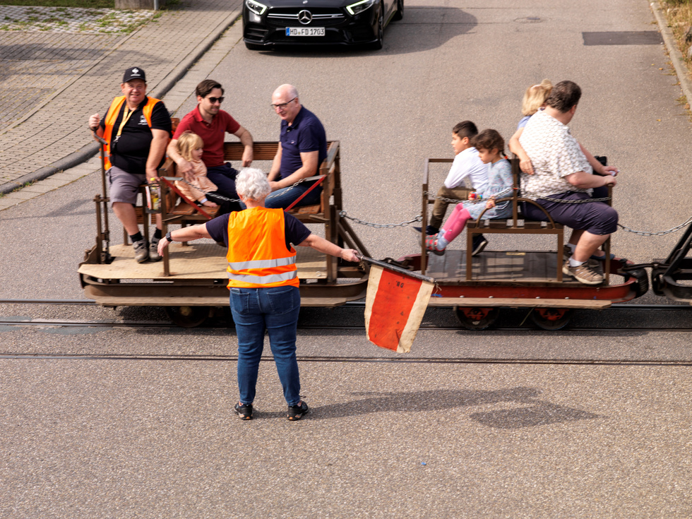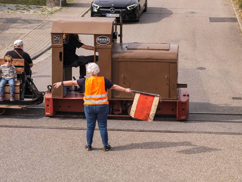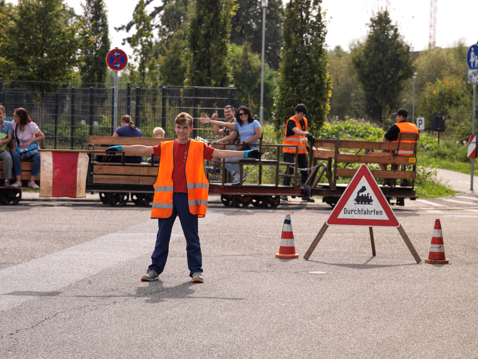 Auffallend sind die Mitarbeiter, die auf und an den fahrenden Zügen Warnweste tragen. Für ein gelungenes Foto von der Bahn scheinen die Westen nicht so ideal zu sein, wir haben uns jedoch auf das Tragen der Westen verständigt, weil im Verlauf der Strecke zwei Straßen überquert werden müssen. Eine im Bereich einer Einmündung, die andere kurz hinter einer unübersichtlichen Linkskurve der Straße. Besser man geht auf Sicherheit.