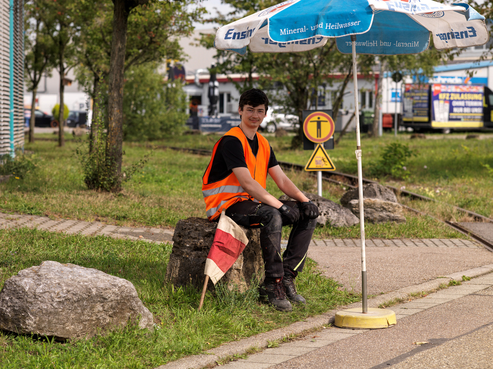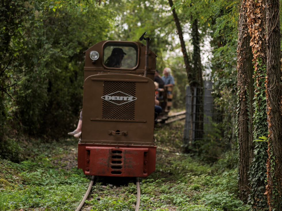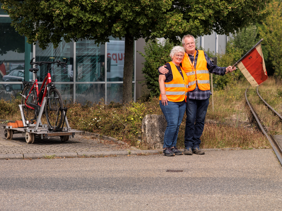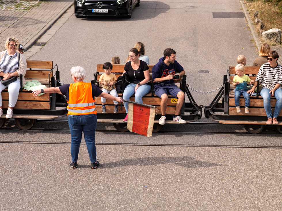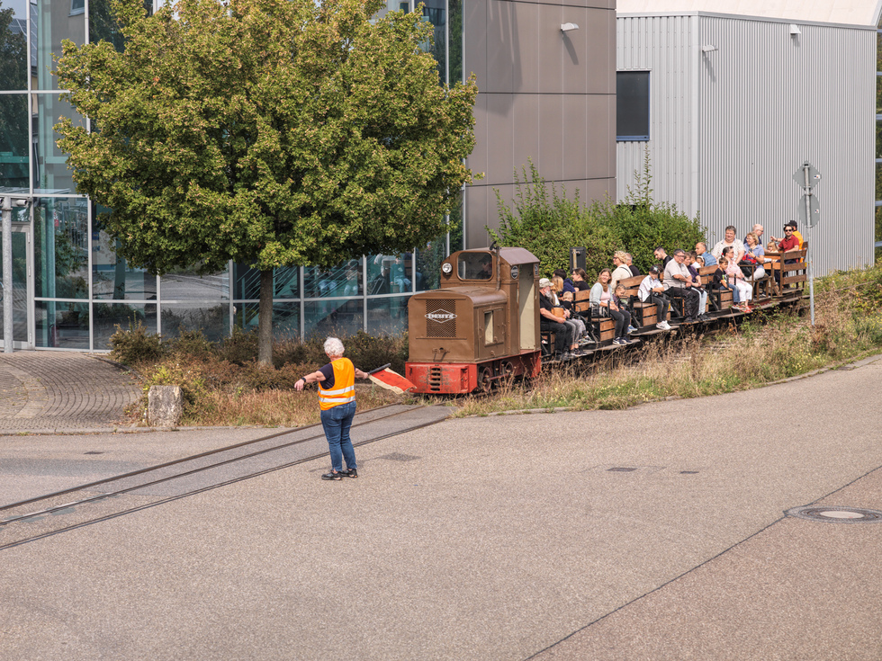 Auffallend sind die Mitarbeiter, die auf und an den fahrenden Zügen Warnweste tragen. Für ein gelungenes Foto von der Bahn scheinen die Westen nicht so ideal zu sein, wir haben uns jedoch auf das Tragen der Westen verständigt, weil im Verlauf der Strecke zwei Straßen überquert werden müssen. Eine im Bereich einer Einmündung, die andere kurz hinter einer unübersichtlichen Linkskurve der Straße. Besser man geht auf Sicherheit.