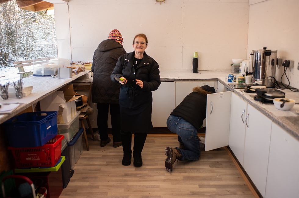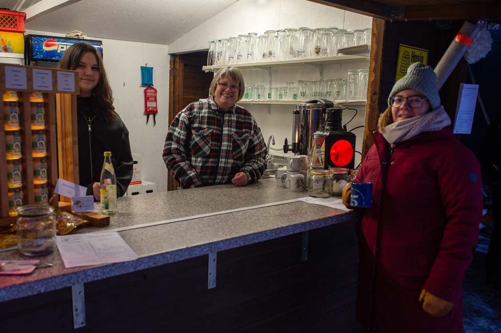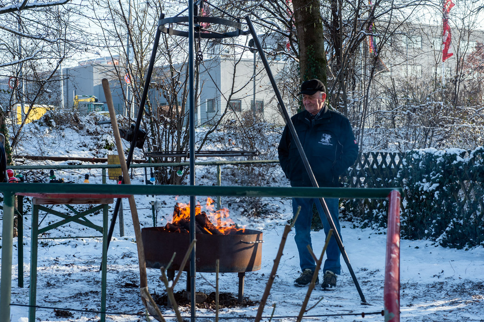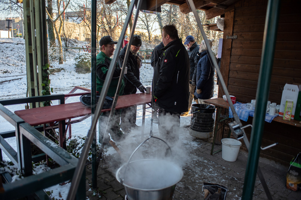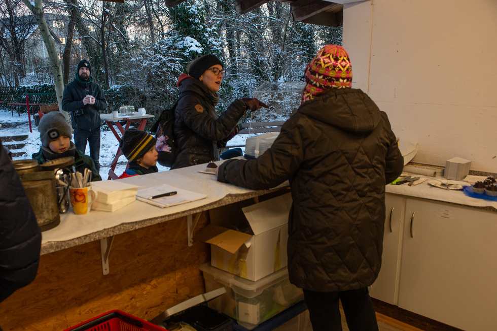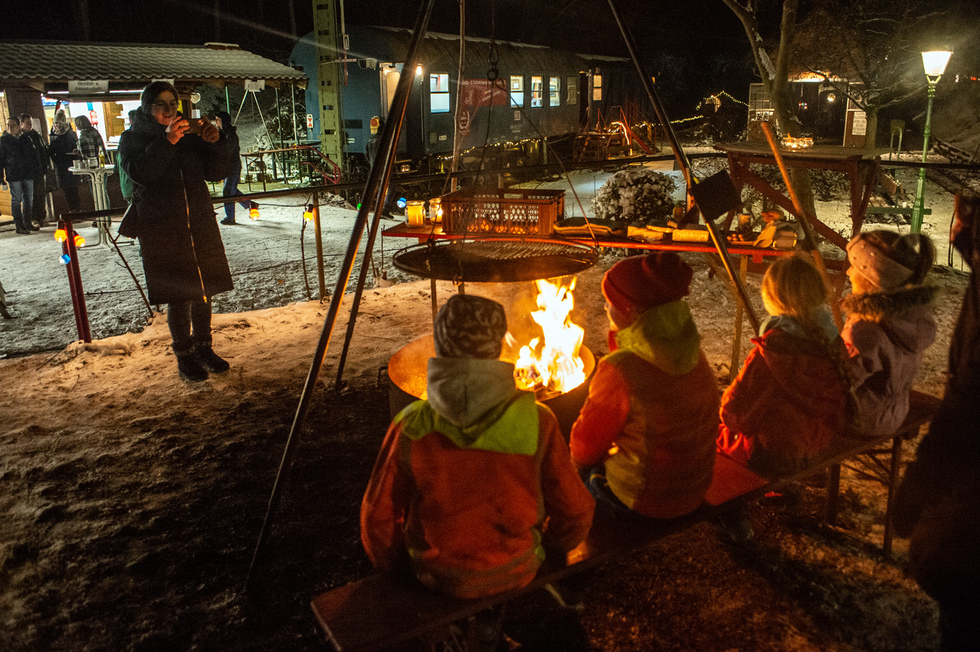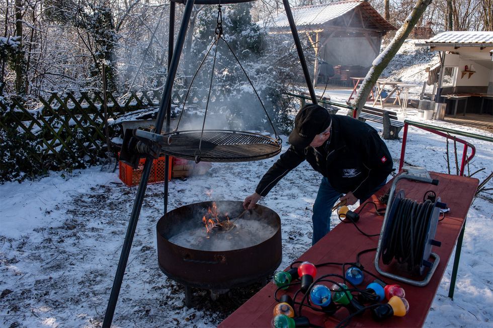Es gab wie gewohnt Kaffee und Kuchen, Getränke, als Spezialität des Fahrtags Glühwein oder Kinderpunsch, sowie Würstchen vom Grill. Als Schwenkgrill stand er diesmal im Freien über offenem Feuer, an dem sich auch gewärmt werden konnte.