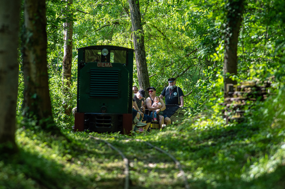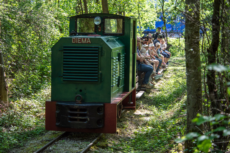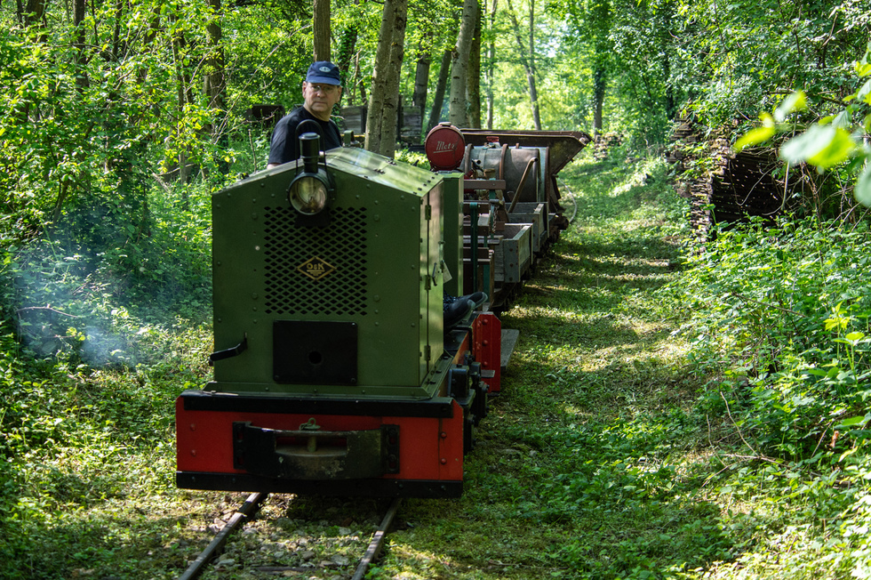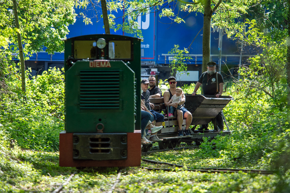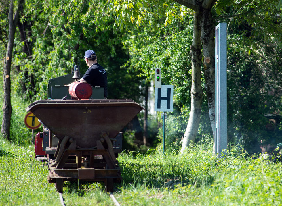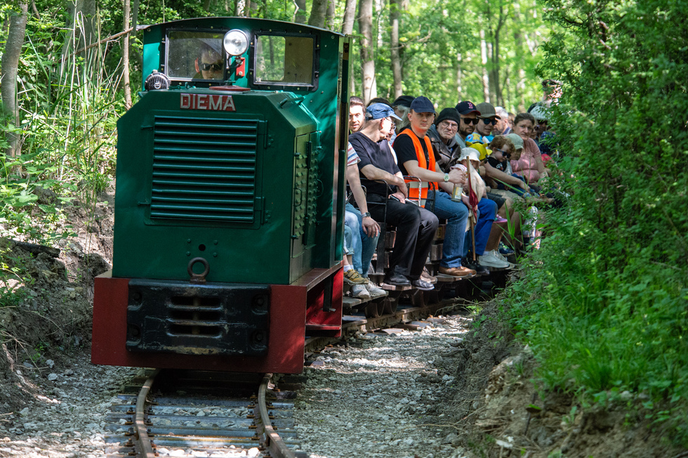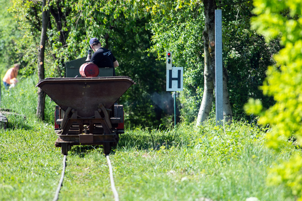 Im Frühjahr wurde die Waldstrecke grundlegend überarbeitet. Auf der Steigungsstrecke parallel zum Leimbach wurden die Gleise entfernt und mit Bagger und Kettenlader viel Erdreich entnommen. Etwa 1,5 m konnte die Trassierung abgesenkt werden, ein kleiner Einschnitt deutet jetzt die erfolgreich abgeschlossenen Arbeiten an. Mit neuen Stahlschwellen und frischen Kleineisen versehen, wurde die neue Trassierung am Maifahrtag befahren. Gerade bei den ersten Fahrten des Tages zeigte es sich, dass selbst bei noch schlüpfrigen Schienen wesentlich gelassener gefahren werden konnte.